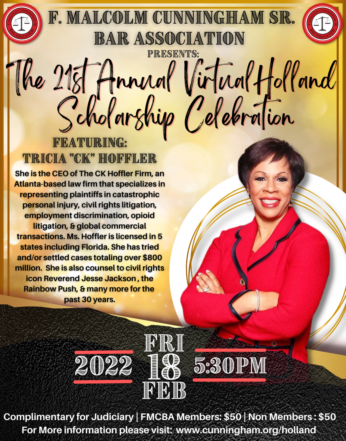 This annual signature celebration is named after the first African-American attorney in Palm Beach County and civil rights pioneer, William H. Holland. The event enables the F. Malcolm Cunningham, Sr. Bar Association to award Florida Bar examination course preparation scholarships to well-deserving 3rd year law students who are scheduled to take the July bar examination.