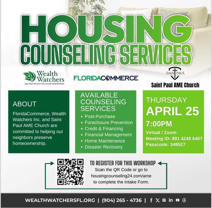 Alright it’s here: everyone connected with Saint Paul it’s time to REGISTER. Follow the QR Code or link. In the date of the workshop select April 25th: St. Paul AME Church 7p (zoom) in the dropdown.. don’t forget to have your family and friends who are home owners register as well! https://www.housingcounseling24.com/ame