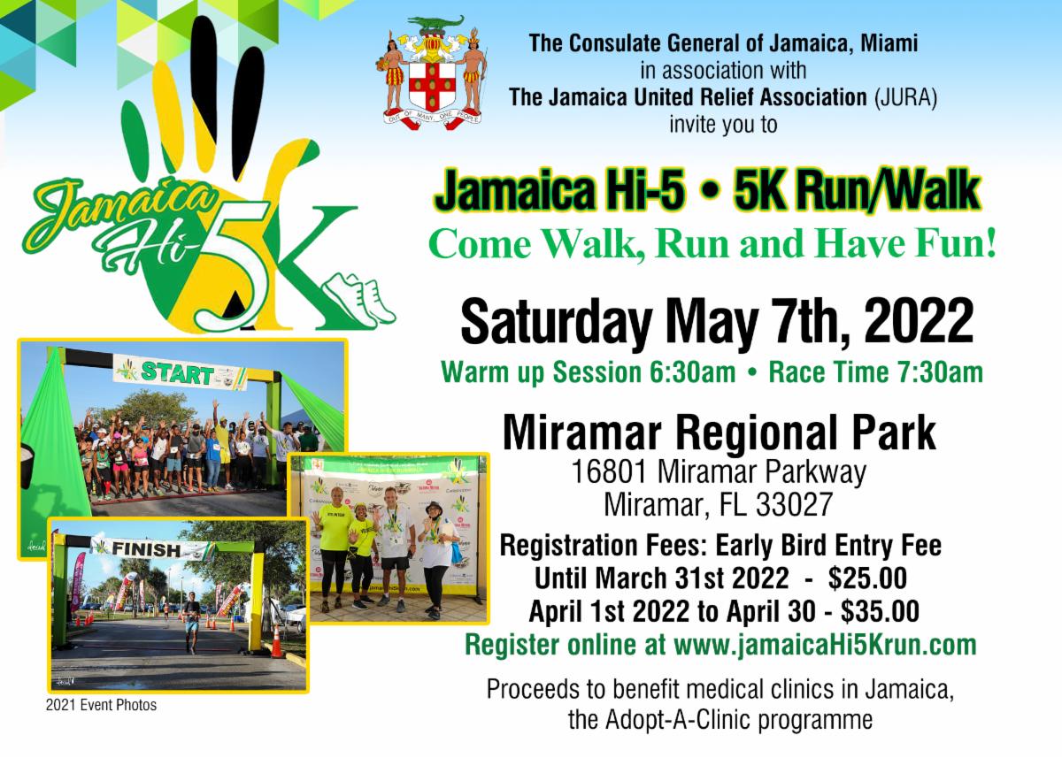 Don’t be left out! Only a few days left for Early Bird Registration to participate in the Jamaica Hi-5 5K Run/Walk at the discounted price of $25. Price increases on April 1, so no “Fooling” around. Register Today and help support the Adopt-A-Clinic initiative under the auspices of Consul General Oliver Mair.