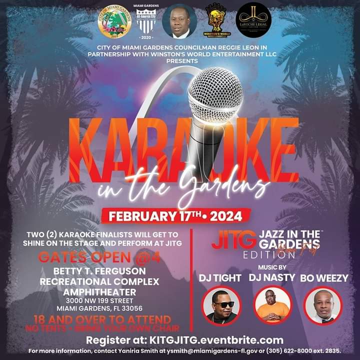 Calling all karaoke superstars! Join us at Karaoke in the Gardens, presented by @cityofmiamigardens Councilman @reggiealeon in partnership with @winstonsworldmia. On February 17th, 2024, head over to the Betty T. Ferguson Recreational Complex Amphitheater for a night of amazing performances. Gates open at 4p, so arrive early to secure your spot. Our talented DJs, @iamdjtight , @djnasty305 , and #TheCrowdPleaser will be providing the vibez to keep the party going. Register now at