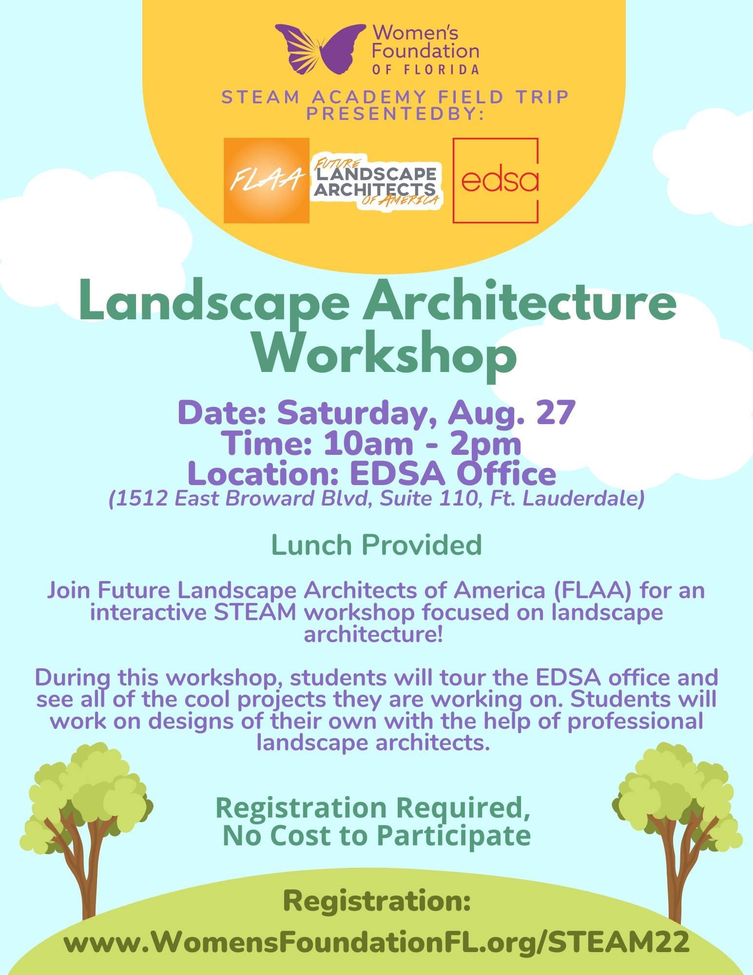 Join Future Landscape Architects of America (FLAA) for an interactive STEM workshop focused on landscape architecture! During this workshop, students will tour the EDSA office and see all of the cool projects they are working on. Students will also work on designs of their own, with the help of professional landscape architects.