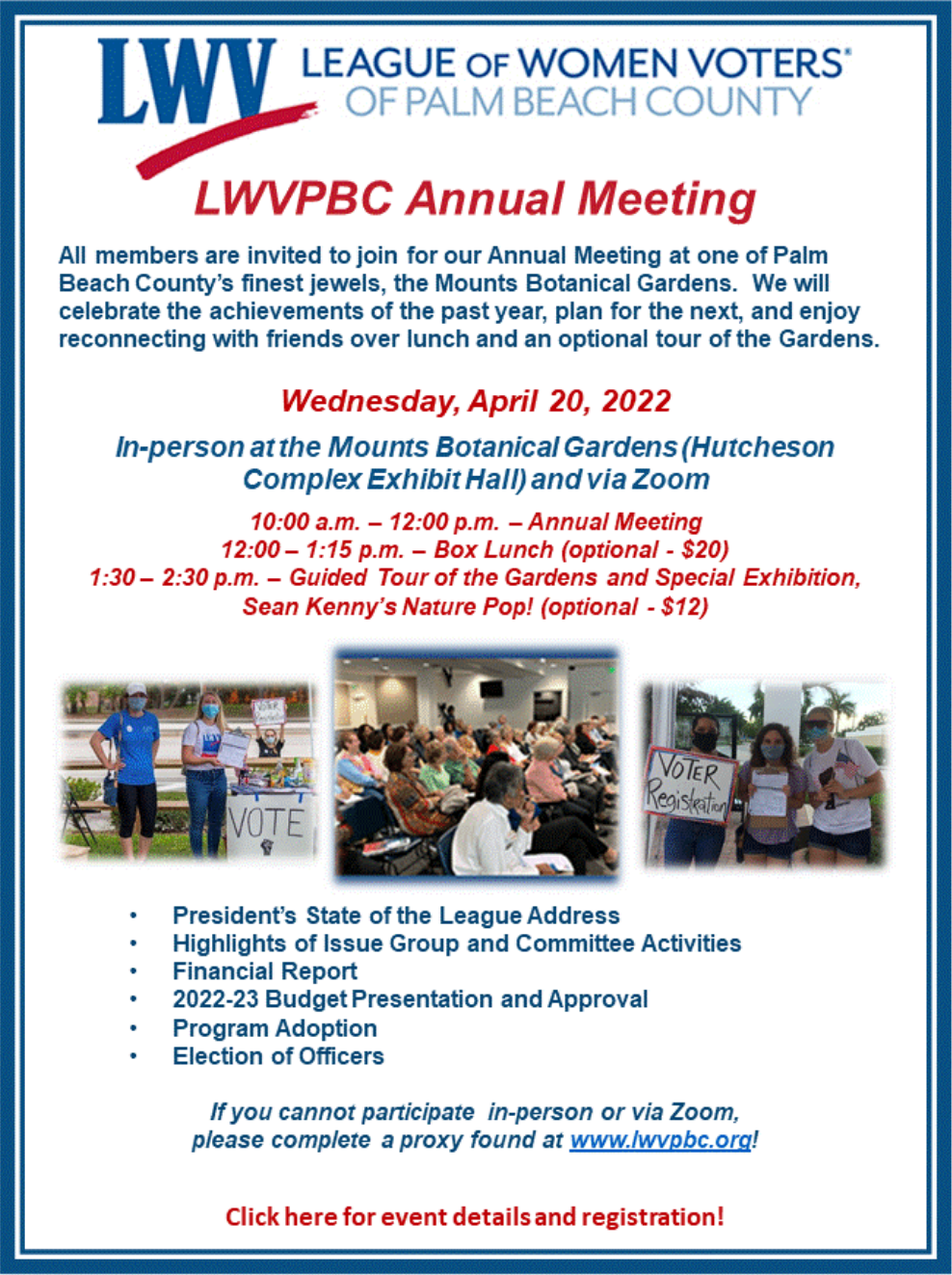 Annual meeting is free. You may choose to also purchase a box lunch and/or a tour of the Mounts Botanical Gardens.