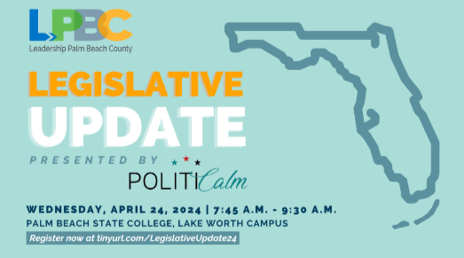 Leadership Palm Beach County is hosting a Legislative Update, presented by PolitiCALM, on April 24, 2024. Check-in and networking will begin at 7:45am, and the program will begin at 8:15am. A lite breakfast, provided by Chick-fil-A Palm/Treasure Coast, and coffee, provided by Starbucks, will be served.