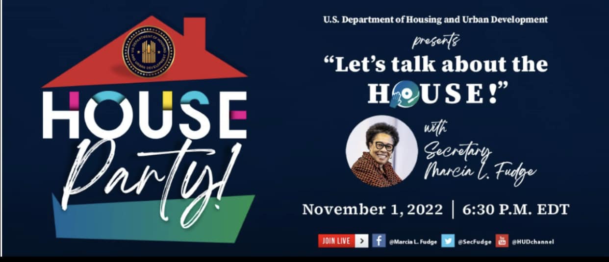 The U.S. Department of Housing and Urban Development’s (HUD) Secretary Marcia L. Fudge will hold a virtual ‘House Party’ on November 1, 2022 at 6:30 EDT to share information on available federal resources and bust common myths around the homebuying process.