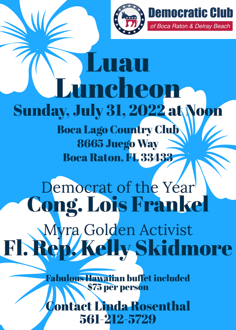 PBC DEMS: You are cordially invited to attend the Boca-Delray Democratic Club’s 16th Annual “Luau Luncheon” on Sunday, July 31st, 12:00PM.