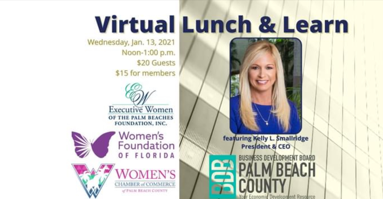 Business Development Board (BDB) President and CEO Kelly L. Smallridge will share a recap of 2020 and preview the outlook for the new year. Join with the Executive Women of the Palm Beaches Foundation, the Women’s Chamber of Commerce and the Women’s Foundation of Florida to learn more about the BDB and how they fulfill their mission — to stimulate economic energy, promote business diversity and enrich the vitality of Palm Beach County through the relocation, retention and expansion of companies to or in Palm Beach County.