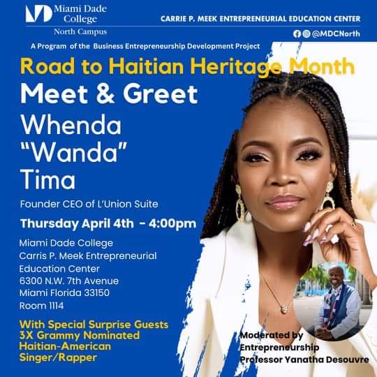 “Come join us for a special evening with the powerhouse CEO of L’Union Suite, Whenda “Wanda” Tima, along with a surprise special guest! 3x Grammy nominated Haitian American artist/rapper moderated by entrepreneurship Professor Yanatha Desouvre