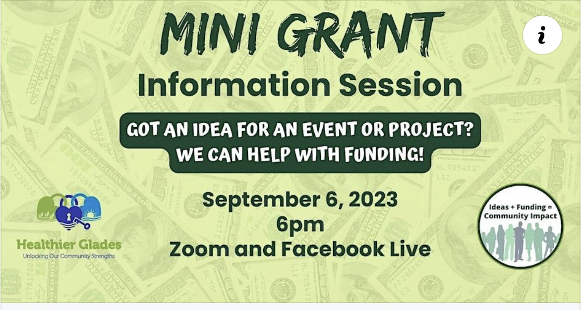 Healthier Glades is hosting an information session about our upcoming mini grant and how to apply. Please click on this link to register for this event.