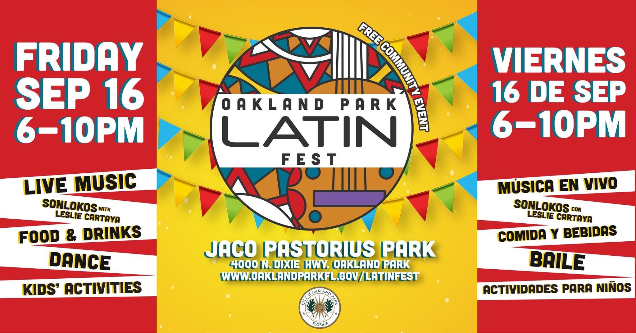 In honor of Hispanic Heritage Month, Oakland Park Latin Fest celebrates Latin culture through food, drink, music, and dance at Jaco Pastorius Park.