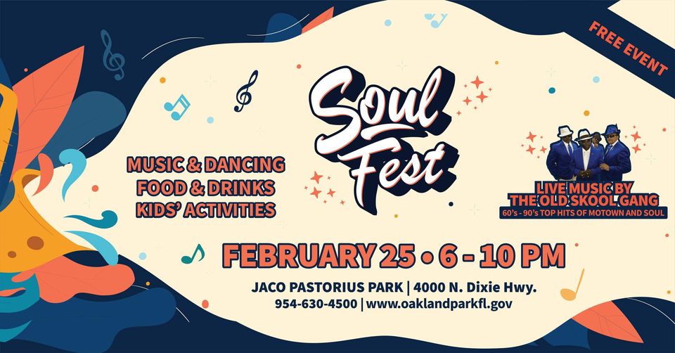 Soul Fest will be held at Jaco Pastorius Park on Friday, February 25th from 6-10PM. For additional information call 954-630-4500 or visit the City’s website: www.oaklandparkfl.gov
