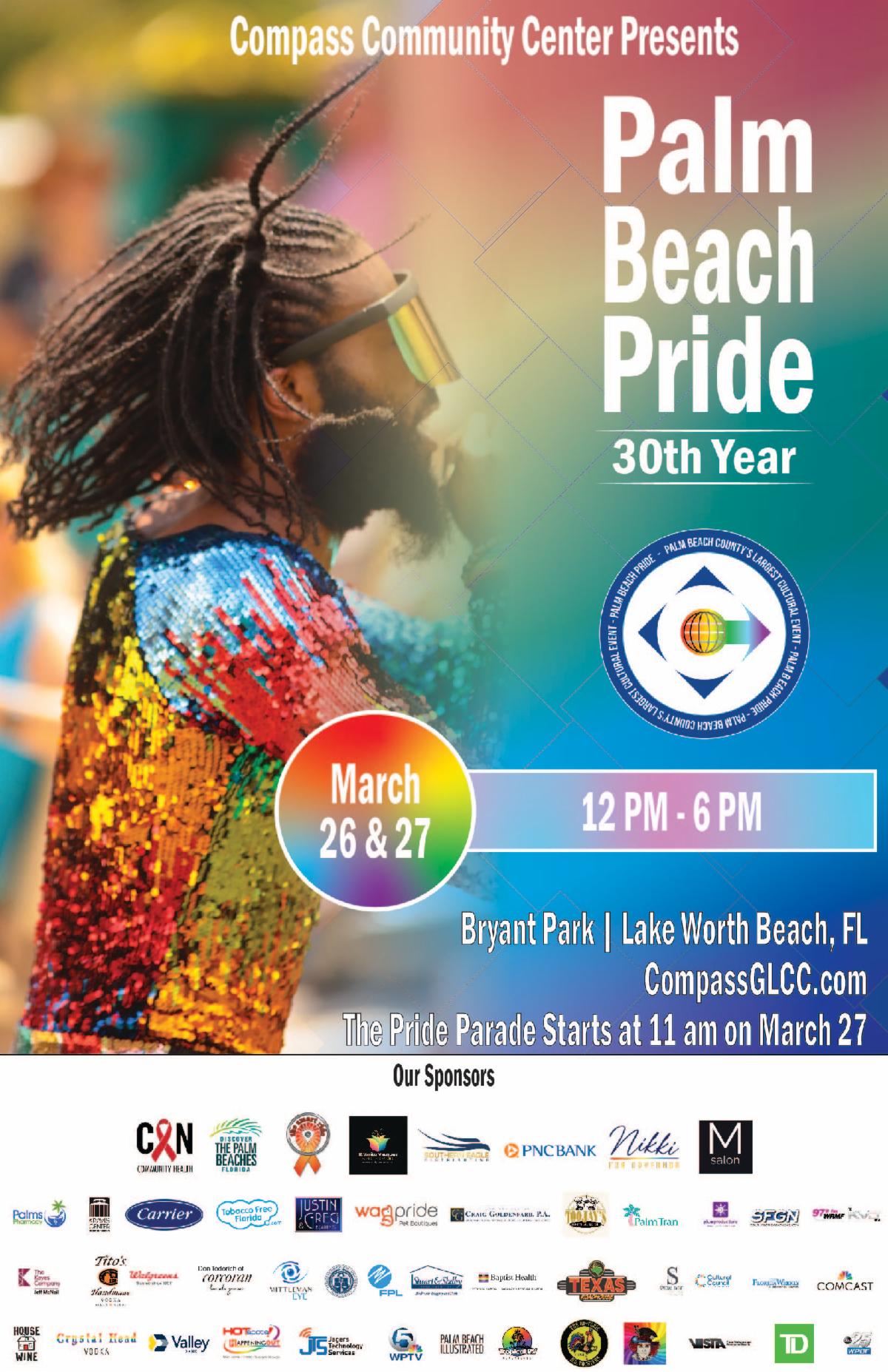 Palm Beach Pride, presented by Compass LGBTQ+ Community Center, is a two day, family & pet friendly festival and a parade that features vendors, music, food and drinks. The event takes place in Bryant Park in Downtown Lake Worth Beach. Vendors from all over the country come to provide information and sell their wares. Pride features both local and international talent. There will also be food trucks, food vendors and specialty beverage vendors. Other features include the Pride Parade (11am on March 27 in Downtown Lake Worth), a large Youth village and elements for senior members of the community.