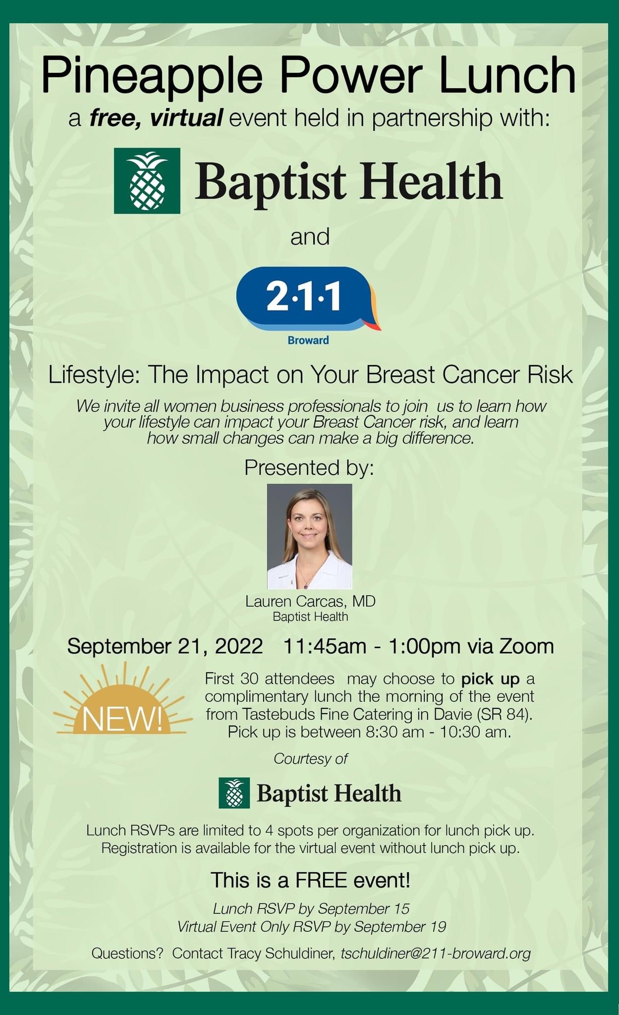 Calling all Business Leaders! Join us for this virtual event with complimentary lunch (PICK UP ONLY) graciously provided by Baptist Health! You may register for virtual event only or for lunch pick up the day of the event / and attend virtually. Pick up is in Davie off of 595 between 8:30 am – 10:30 am.