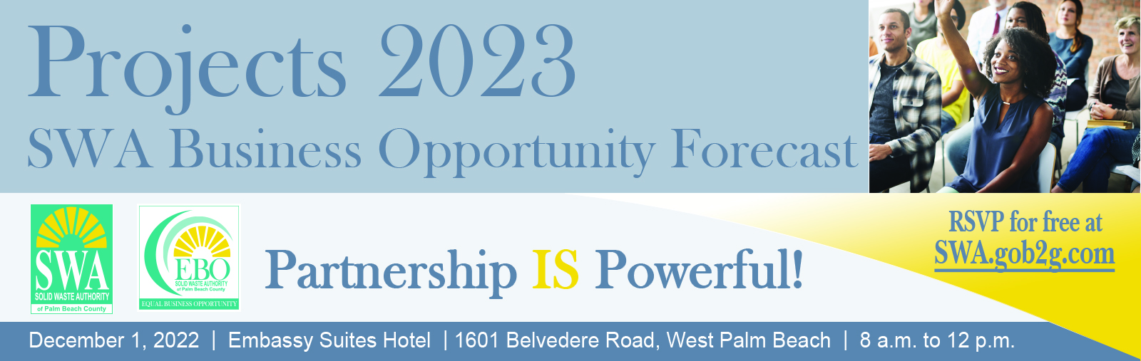 The Solid Waste Authority (SWA) of Palm Beach County would like to invite you to our Projects 2023 SWA Business Opportunity Forecast Conference. Start Your Day – with a delicious breakfast with SWA’s Executive Director Dan Pellowitz. This Business Conference is December 1st and will be power packed with information about upcoming SWA Projects and Major Purchasing Opportunities with SWA for 2023. Learn the essentials of developing your business plan and gain a clear vision of your desired destination. SWA Directors and Presenters are very knowledgeable and can help you win procurement contracts.