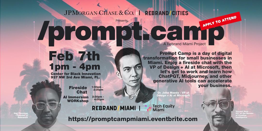 Rebrand Cities is excited to announce “Prompt Camp” in Miami on February 7th, from 1pm to 4pm. Sponsored by JPMorgan Chase & Co., spots are limited, so apply today. The event will focus on digital transformation for small businesses and will be held at the Center for Black Innovation in Overtown.