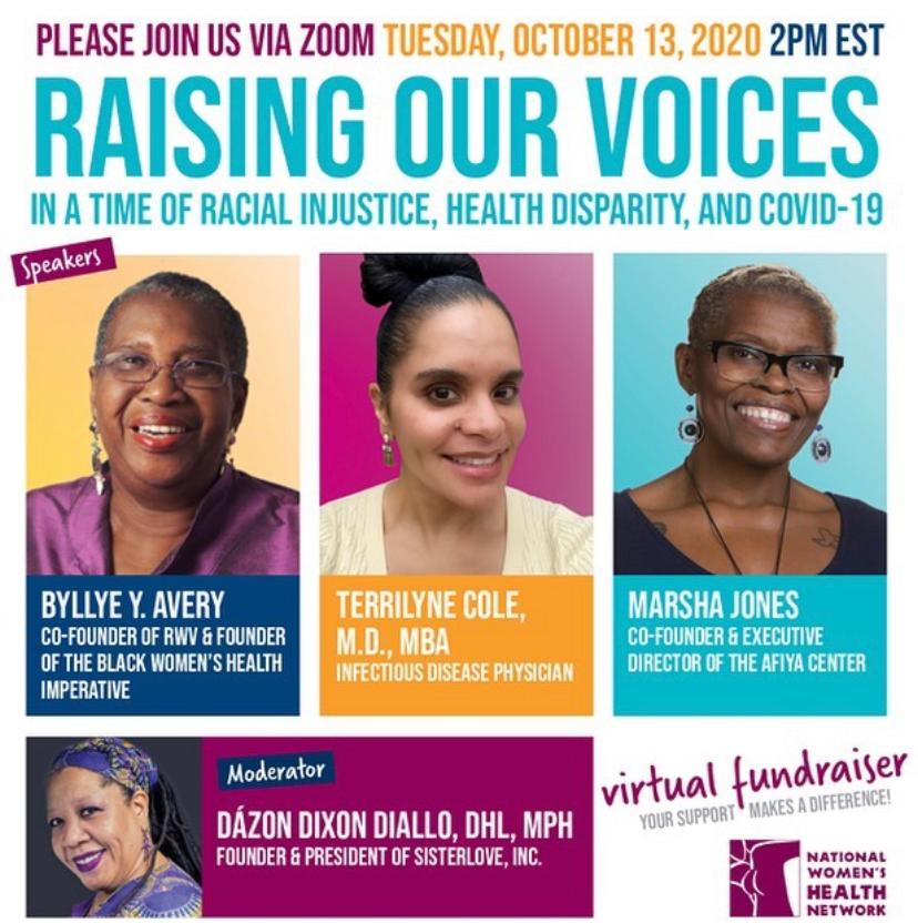 Raising Our Voices, in a time of Racial Injustice, Health Disparity and COVID-19. Join host Dázon Diallo and her guests Bylle Avery, Terrilyne Cole and Marsha Jones. National Woman’s Health Network. Join them via Zoom