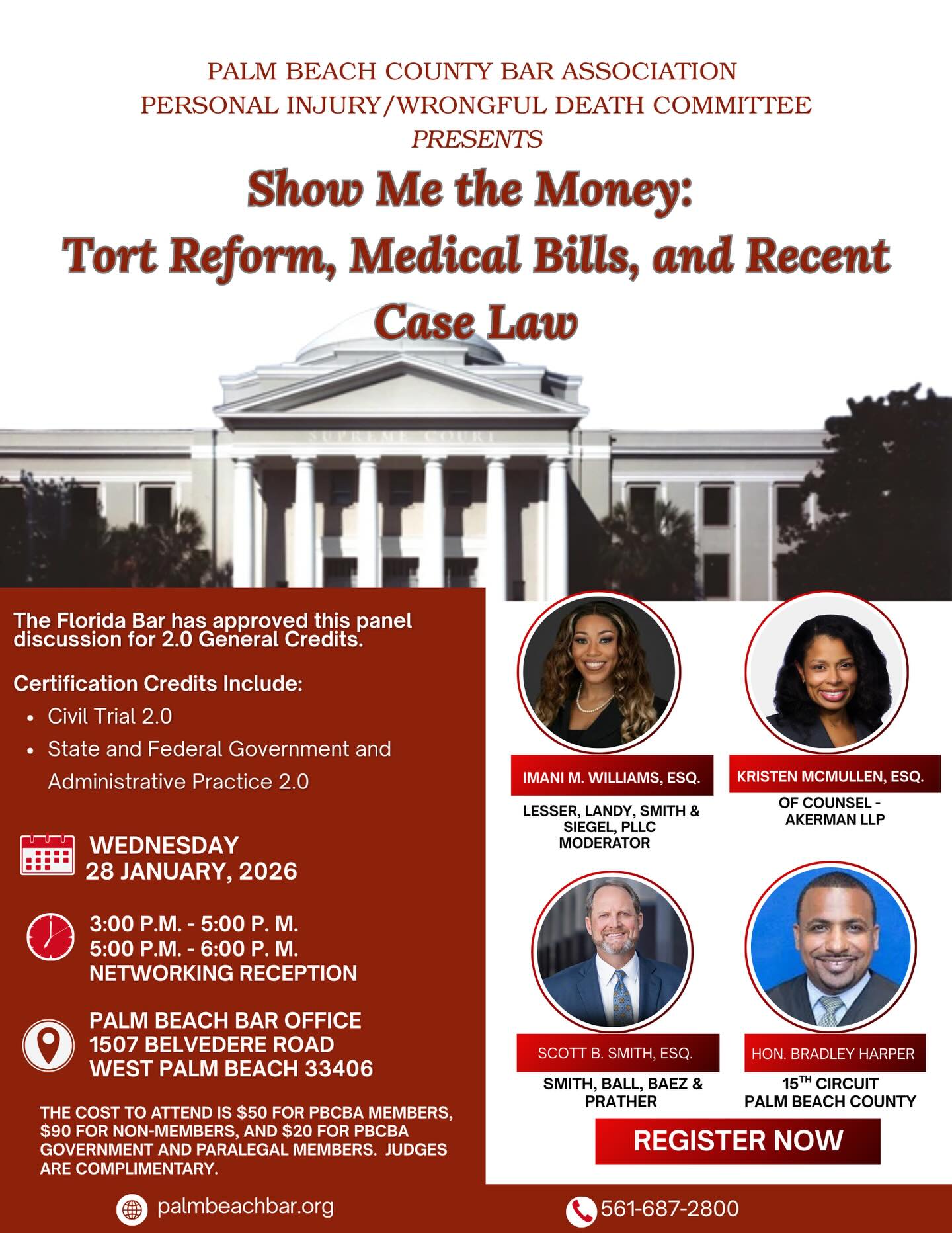 The Palm Beach County Bar Association Personal Injury/Wrongful Death CLE Committee will be hosting its first official CLE and Happy Hour of the new year on Wednesday, January 28, 2026, from 3:00–5:00 PM.