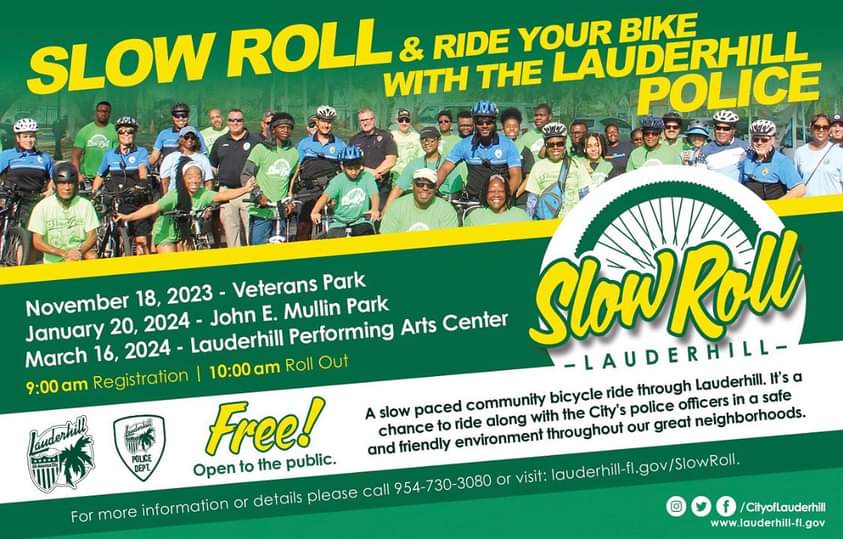 – Slow Roll is a slow paced community bicycle ride through Lauderhill. It’s a chance to ride along with the City’s police officers in a safe and friendly environment throughout our great neighborhoods.