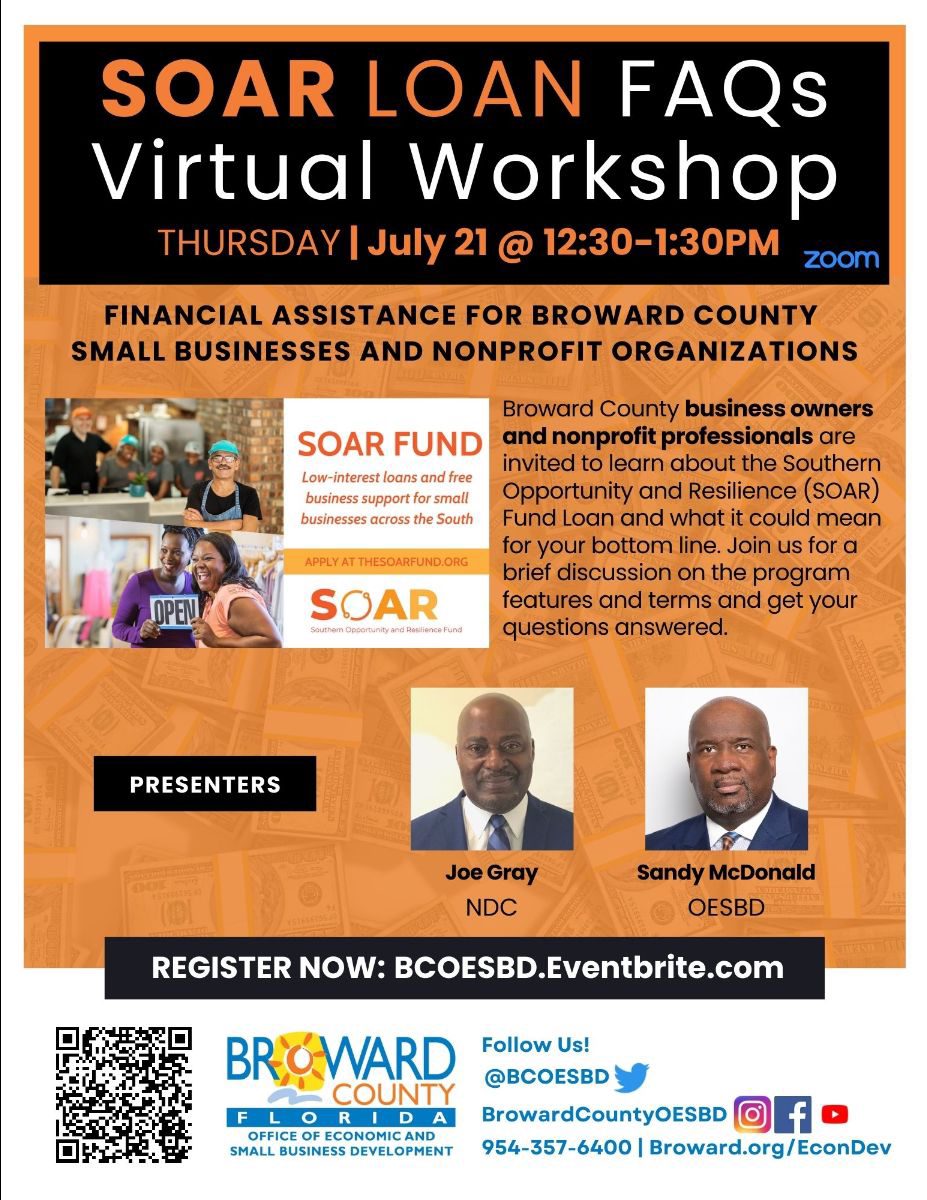 Grab your lunch and join us virtually to get the facts on the Southern Opportunity and Resilience (SOAR) Fund Loan during this free, virtual workshop. Don’t miss out on the information you need to access this funding program for Broward County-based nonprofits and small businesses.