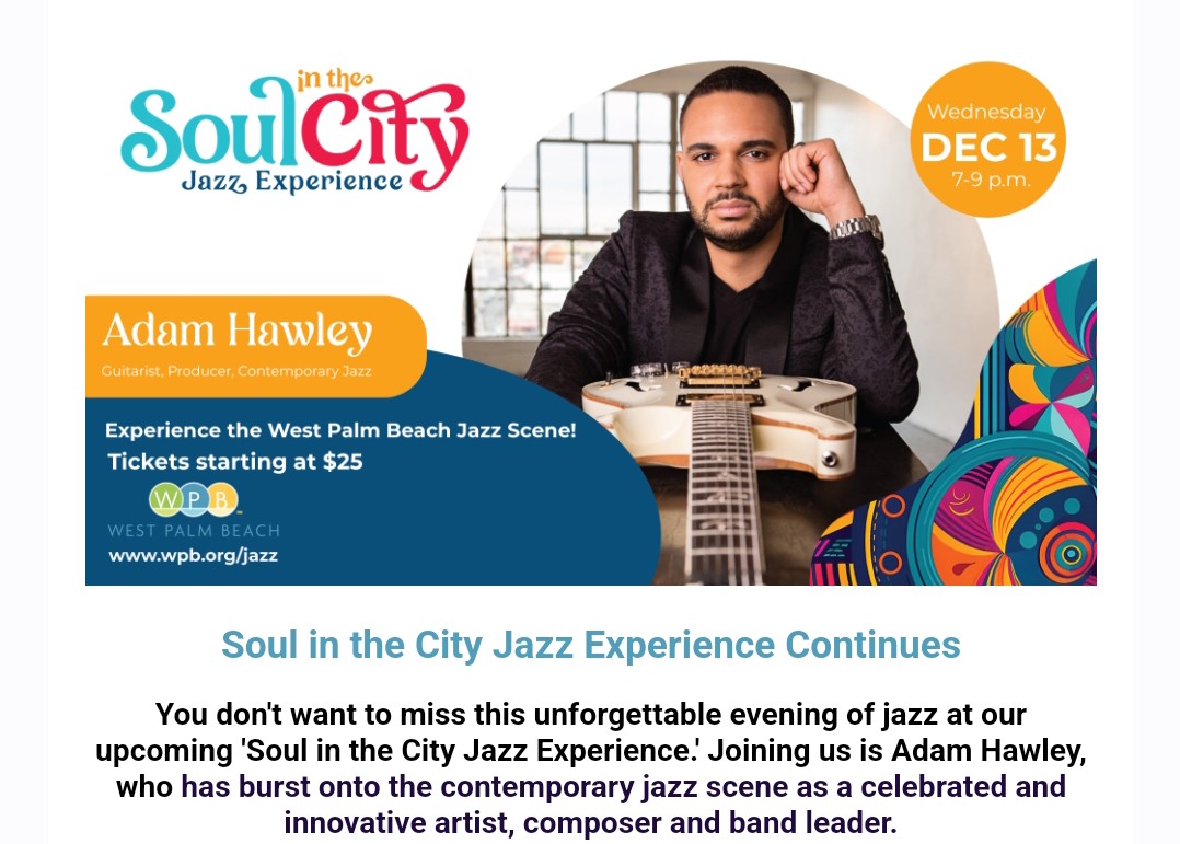 You don’t want to miss this unforgettable evening of jazz at our upcoming ‘Soul in the City Jazz Experience.’ Joining us is Adam Hawley, who has burst onto the contemporary jazz scene as a celebrated and innovative artist, composer and band leader.