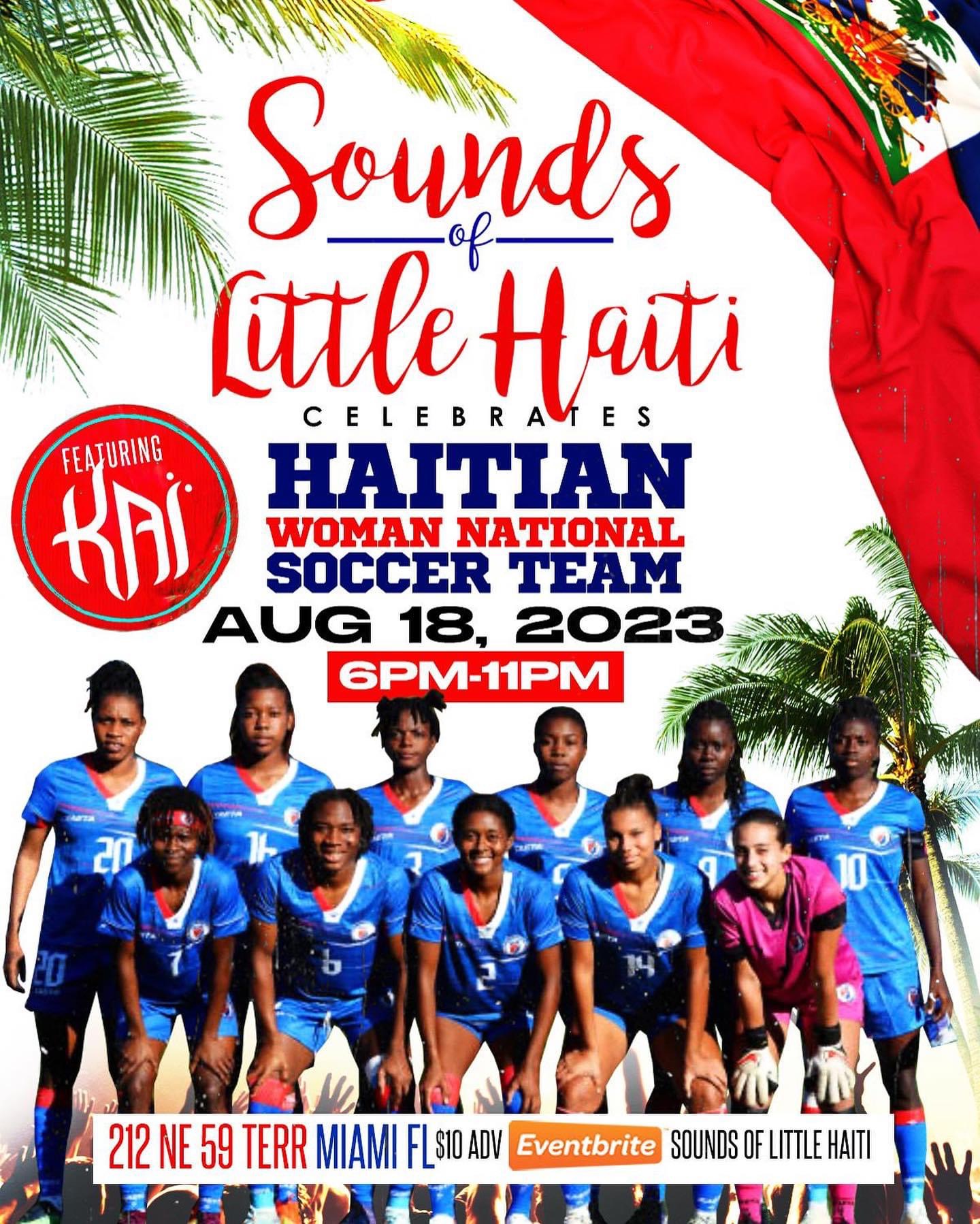 Sounds of Little Haiti celebrates the Haitian Woman National Soccer Team with the help of KAI’s live performance! When: Aug 18, 2023 Where: Little Haiti Cultural Center 212 NE 59 Terr. Miami, FL Time: 6 pm – 11 pm