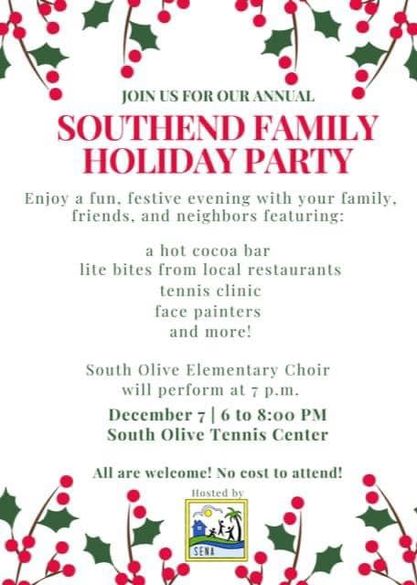 South End Neighborhood Association Family Holiday Party is next Wednesday from 6-8pm at the South Olive Tennis Center. See you there!
