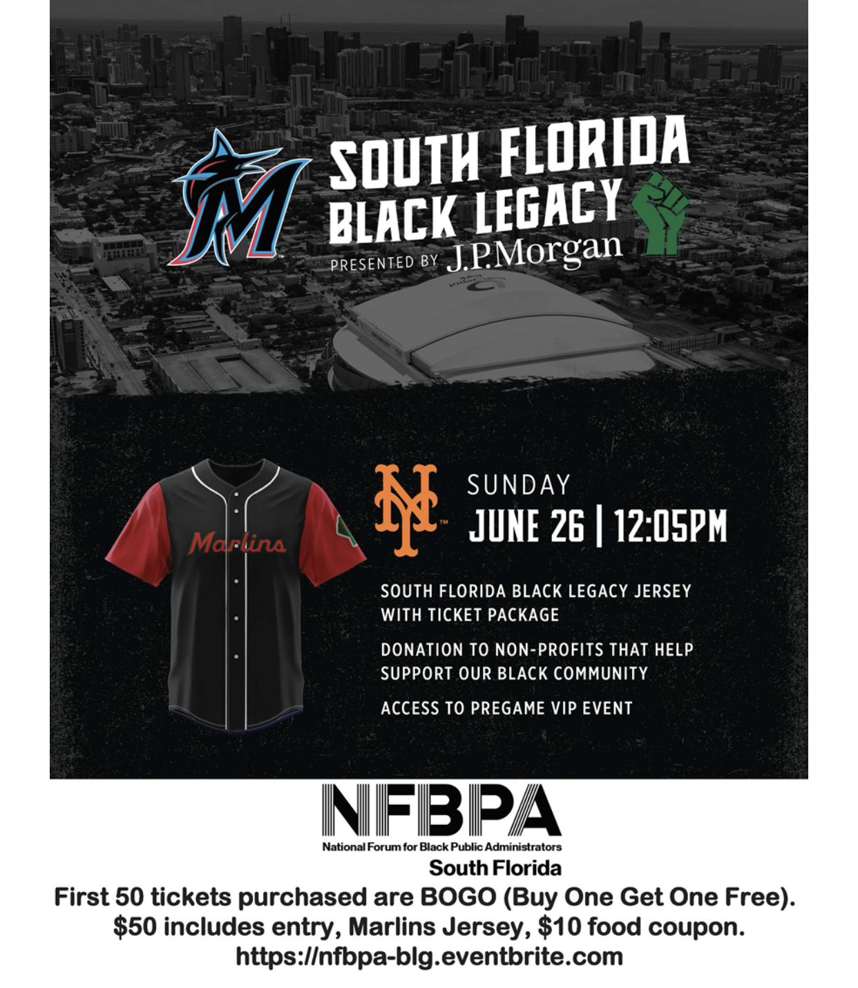 First 50 tickets purchased are BOGO (Buy One Get One Free). $50 includes entry, Marlins Jersey, $10 food coupon. Commemorative Marlins South Florida Black Legacy Celebration Jersey distribution is available for pick up from when gates open at 10:30AM until the end of the 4th inning. Please invite family, co-workers, and friends to attend!!!