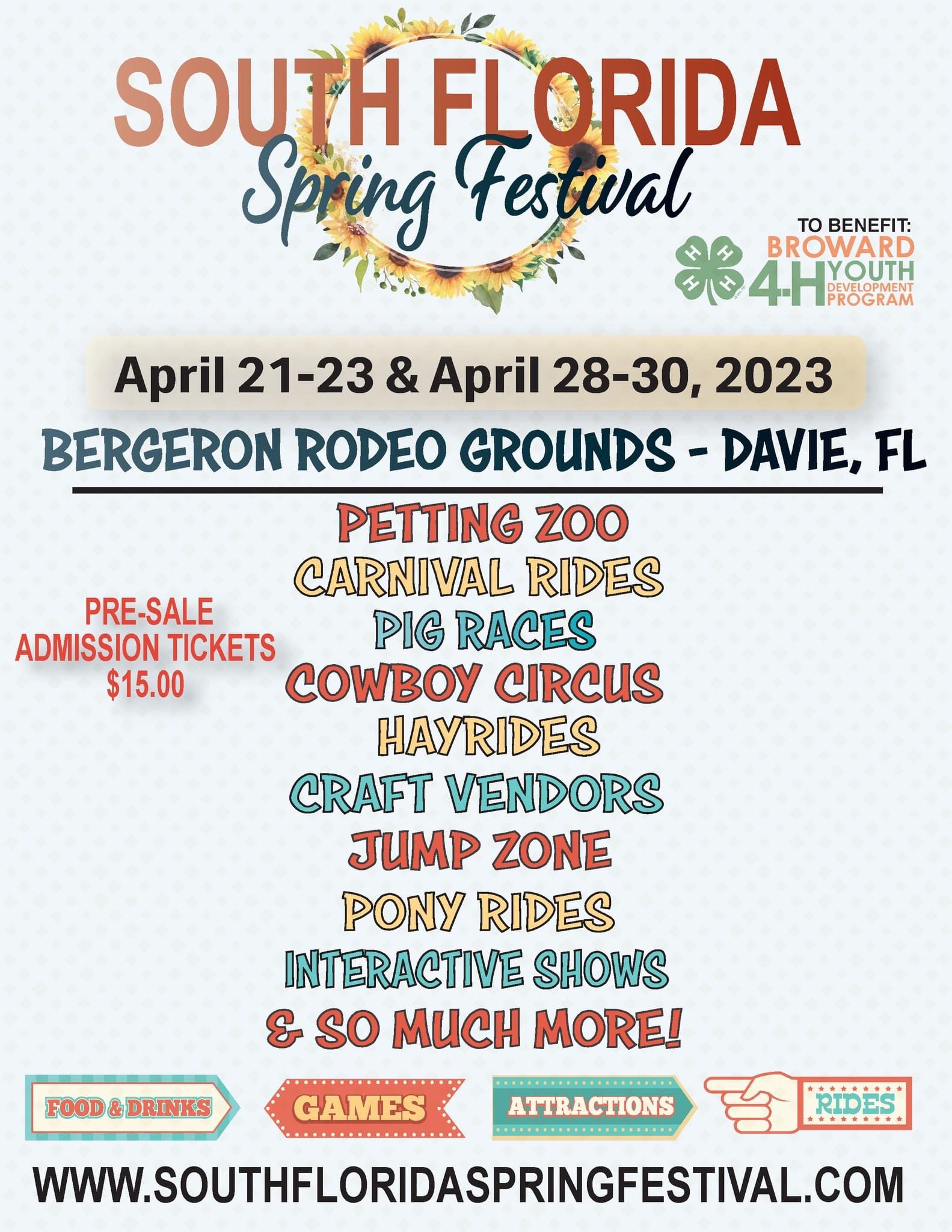 SAVE THE DATE! The South Florida Spring Festival is coming back to Bergeron Rodeo Grounds for TWO Weekends! April 21-23 & April 28-30! Fun for the entire family! Vendor spots will be LIMITED for each day!