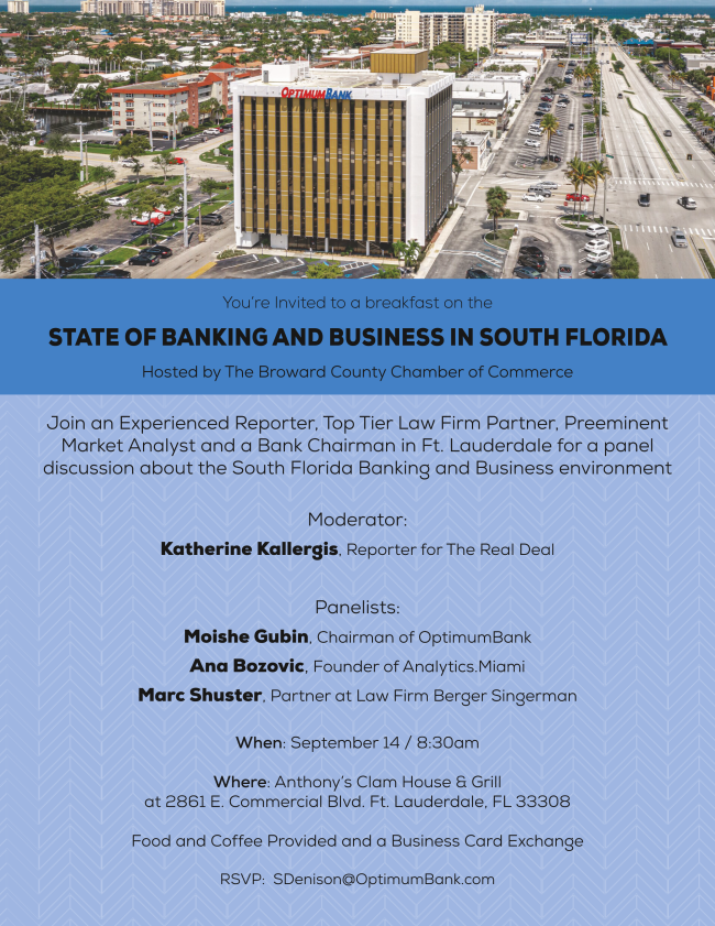 Opening remarks will be made by State Senator Jason Pizzo, followed by a panel discussion with OptimumBank Chairman, Moishe Gubin, Berger Singerman law partner, Marc Shuster and Analytics Miami founder, Ana Bozovic.