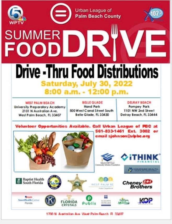 The Urban League of PBC, in partnership with Channel 5 and X102.3FM, has partnered with the Guardians to hold a food distribution in western PBC! Join us for a BIG drive-thru food distribution that you don’t want to miss on Saturday, July 30, at 8am! Please remove items from your trunk and back seat so that volunteers can load your food items.