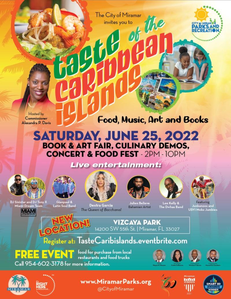 The City of Miramar will celebrate Caribbean American Heritage Month in June with its new and improved signature event, Taste of the Caribbean Islands. This year’s event will feature a Book & Art Fair, Culinary Demos, Food Fest, and a Live Concert at Miramar’s Vizcaya Park located at 14200 SW 55th St. Miramar, FL 33027 on Saturday, June 25, 2022, from 2:00 p.m. to 10:00 p.m.