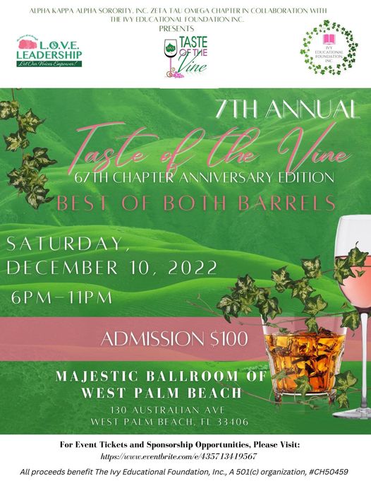 The 7th Annual Taste of the Vine, 67th Chapter Anniversary Edition, Best of Both Barrels. All proceeds go to The Ivy education foundation, Inc.