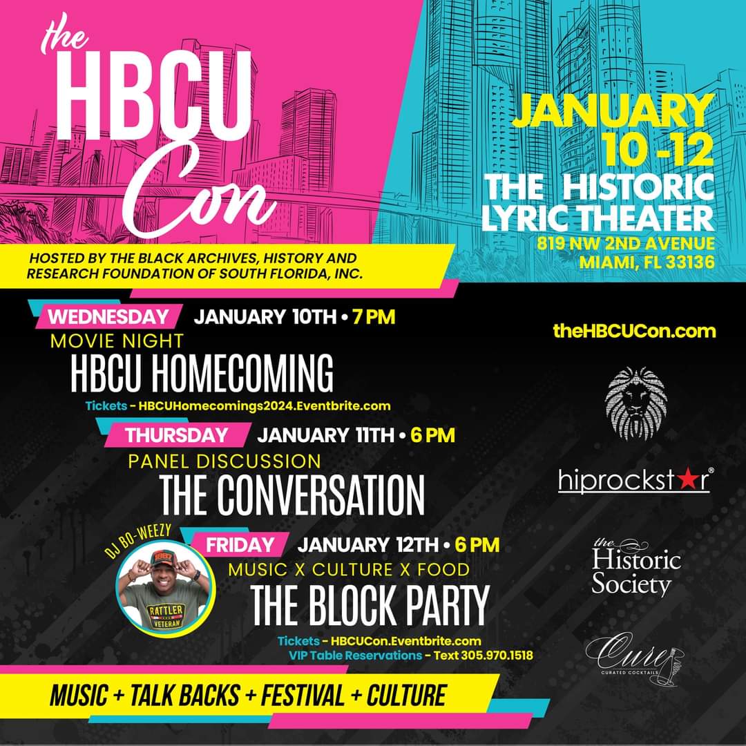 The Block Party (January 12, 2024): The Lyric Plaza will come alive with the cultural celebration known as The Block Party. Set to the sounds curated by DJ Bo-Weezy, the festivities begin at 6 pm and feature food trucks, fun, friendly rivalry, and set to the HBCU soundtrack. Tickets are available at HBCUCon.eventbrite.com and for VIP Table Reservations call 305.970.1518.