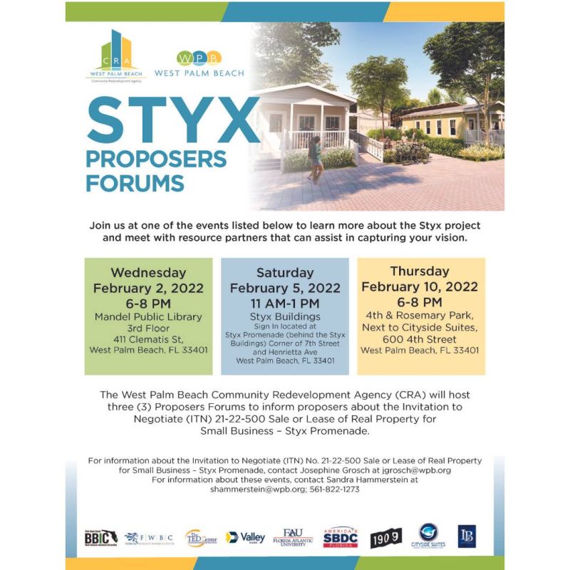 The West Palm Beach Community Redevelopment Agency (CRA) will host three forums to discuss the process of proposing for the sale or lease of properties within the historic Styx Promenade.