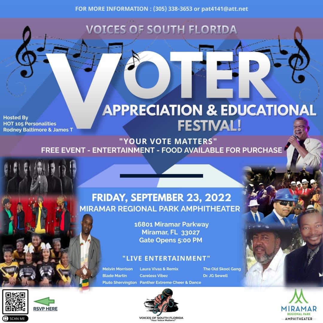 The VOTER Appreciation & Educational Festival sponsored by the VOICES OF SOUTH FLORIDA Educating our Young Voters regarding the importance of registering, voting and issues. Much more will keep you in the Loop. For additional info. Contact Ms Patricia Mellerson, Founder/CEO pat4141@att.net