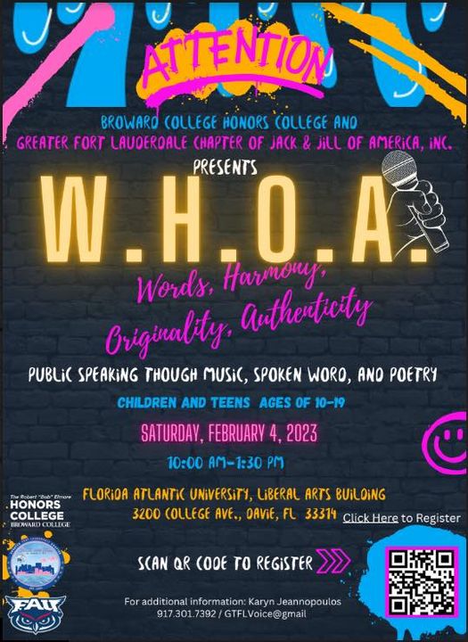The Greater Fort Lauderdale Chapter of Jack and Jill of America , Inc. Oratorical W.H.O.A. Workshop is Saturday, February 4, 2023, 10:00 AM – 1:30 PM at Florida Atlantic University-Davie Campus. We are looking forward to introducing the skills of public speaking to a large group of brilliant young minds, ages 10-19, through music, poetry, and so much more.