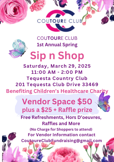 Tequesta Country Club 201 Tequesta Club DriveThe Coutoure Club is a volunteer organization of women dedicated to increasing awareness of Children’s Healthcare Charity and its mission to raise money for children's charities. CHC makes grants available to non-profit organizations in Palm Beach County and throughout South Florida that enhance the health and welfare of our children and the future of our community. One of our members gave me your information from a Holiday Bazaar she attended this past November. Coutoure Club is proudly hosting its 1st Annual Spring Sip and Shop, to benefit Children's Healthcare Charity, Inc.