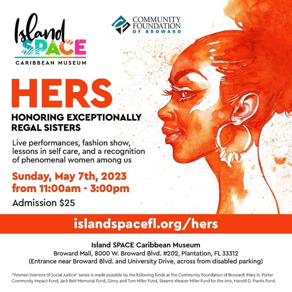 Join Island SPACE Caribbean Museum as we present musical and spoken word performances in celebration of the Caribbean woman warrior spirit; self care for the everyday-phenomenal women among us, with instructions on hair care, nails, skin, mindfulness and wellness for our sustenance inside and out; and honor the woman trailblazers celebrated in the Island SPACE Caribbean Sheroes exhibition. Get tickets at https://islandspacefl.org/hers