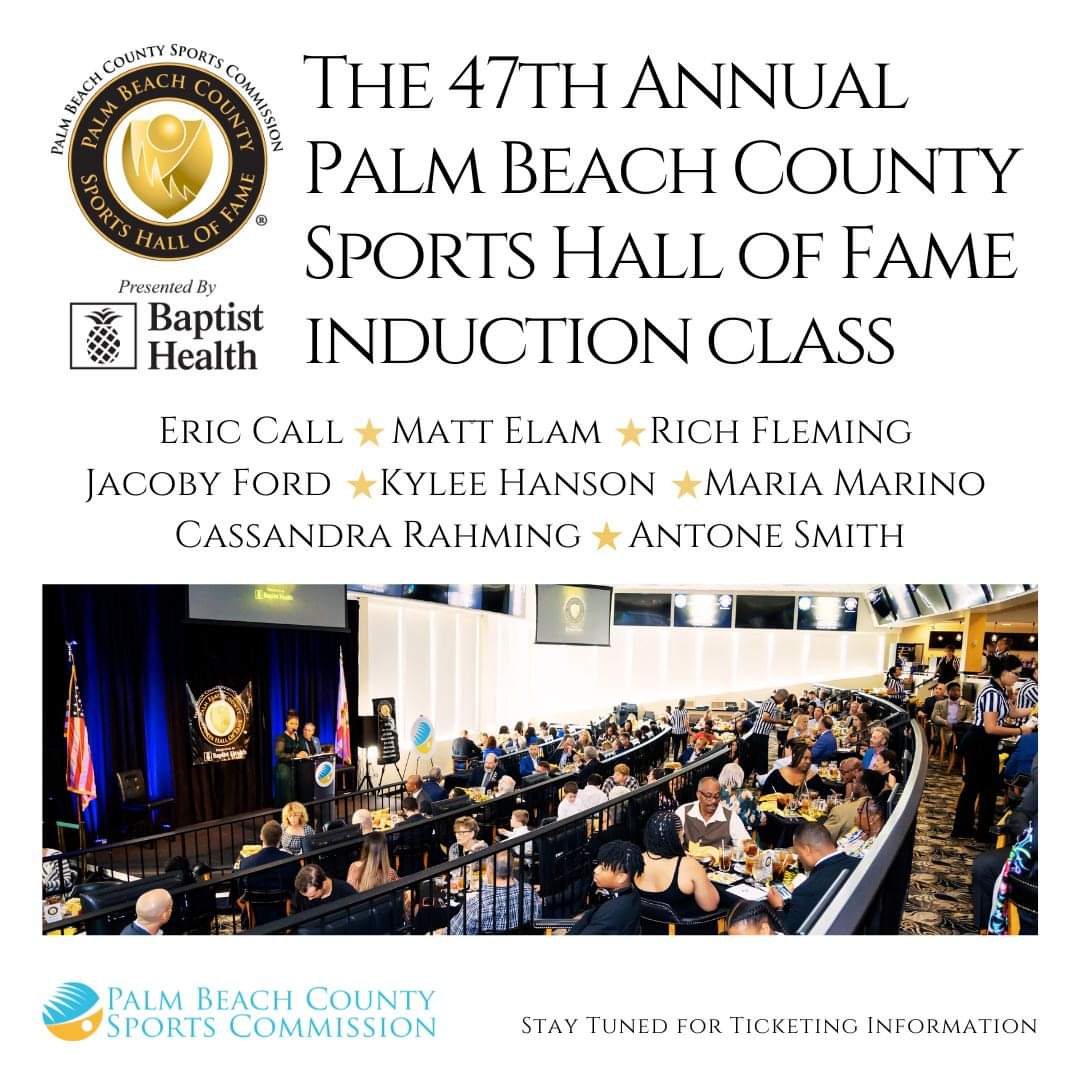🏆 Drumroll, please! 🎉 Announcing the 2024 Palm Beach County Sports Hall of Fame inductees: Eric Call, Matt Elam, Rich Fleming, Jacoby Ford, Kylee Hanson, Maria Marino, Cassandra Rahming, and Antone Smith. The class will be celebrated at PBKC at Palm Beach Kennel Club on March 24.