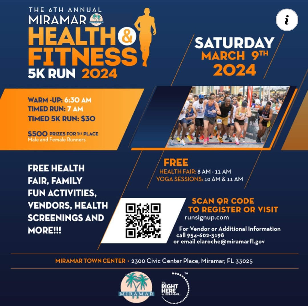 The 5th annual Miramar Health and Fitness 5k Run is back! Saturday, March 9 2024 | 7am | Miramar Town Center Timed 5k run, $500 prizes for 1st place Male and Female runners! There will be a free Yoga session and Health fair with fun activities, health screening and more post-run! A great run to promote health and wellness in the City of Miramar, the fittest City in the country! Scan the QR code below or visit https://runsignup.com/Races and search "Miramar" to sign up!