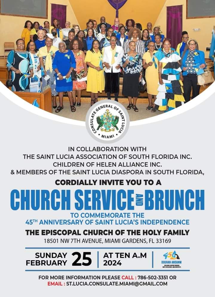 Please join in celebrating Saint Lucia's 45th Anniversary of Independence with a church service and Brunch on Sunday, February 25th. See flyer for details.