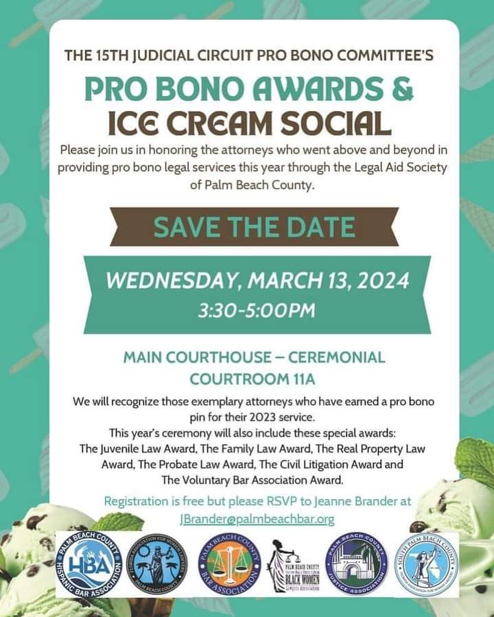 📅 SAVE THE DATE! SDCBWLA is thrilled to be a proud sponsor of the Fifteenth Judicial Circuit’s Pro Bono Awards and Ice Cream Social. 🏆 Join us in celebrating the selfless lawyers who dedicate their spare time to providing legal services to the disadvantaged. 🤝 Together, let’s honor their commitment to justice! #ProBonoAwards #SDCBWLA #LegalJustice 🌟