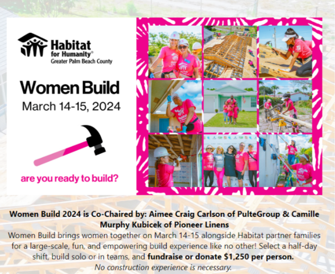 I am honored to Co-Chair Habitat for Humanity of Greater Palm Beach County Women Build 2024. Together, we will change the lives of three families in Lake Worth Beach by completing new homes for them. The impact doesn’t stop there – we will also complete renovations on other homes in the same neighborhood. This effort not only focuses on building walls and roofs but also on creating safe spaces filled with hopes and dreams. I participated last year and it was an incredibly moving and rewarding experience. I thoroughly enjoyed getting to know the families [...]