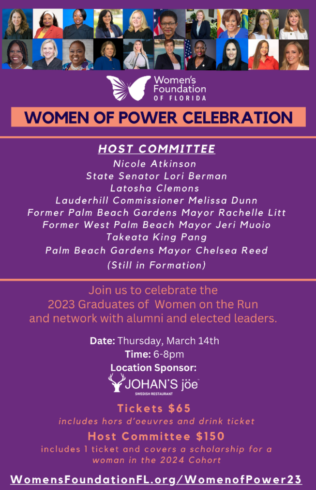 Florida Women on the Run (WOR) is a transformative non-partisan campaign training and mentorship program that equips women to step confidently into political roles, campaign leadership, or community advocacy. Join us to celebrate the 2023 Graduate of Women on the Run and network with alumni and elected leaders. Date: Thursday, March 14th Time: 6-8pm Location Sponsor: Johan's Joe Swedish Restaurant in West Palm Beach Tickets $65 includes hors d'oevres and drink ticket Host Committee $150 includes 1 ticket and covers a scholarship for a women in the 2024 [...]