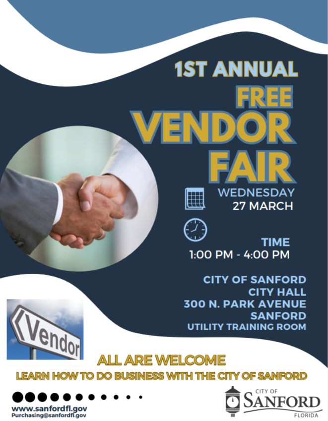 1ST ANNUAL FREE VENDOR FAIR LEARN HOW TO DO BUSINESS WITH THE CITY OF SANFORD WEDNESDAY, MARCH 27, 2024 1:00PM – 4:00PM Utilities Training Room 300 N. Park Avenue Sanford, FL 32772 ALL ARE WELCOME! purchasing@sanfordfl.gov