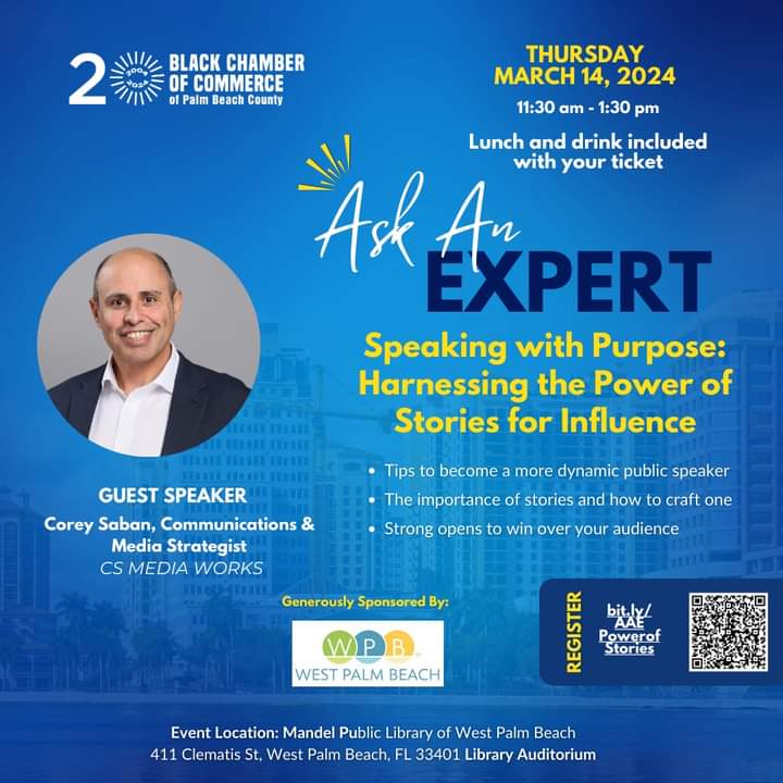 Boost Your Business with Storytelling! 🚀Ready to captivate your audience and drive results? Join us for an exclusive Lunch & Learn with Corey Saban, a master of storytelling and public speaking. 🎤✨ Register now to secure your seat! 🌟 https://bit.ly/AAEPowerofStories #PowerOfStories #BusinessGrowth #bccpbc #westpalmbeachevents #tellyourstory