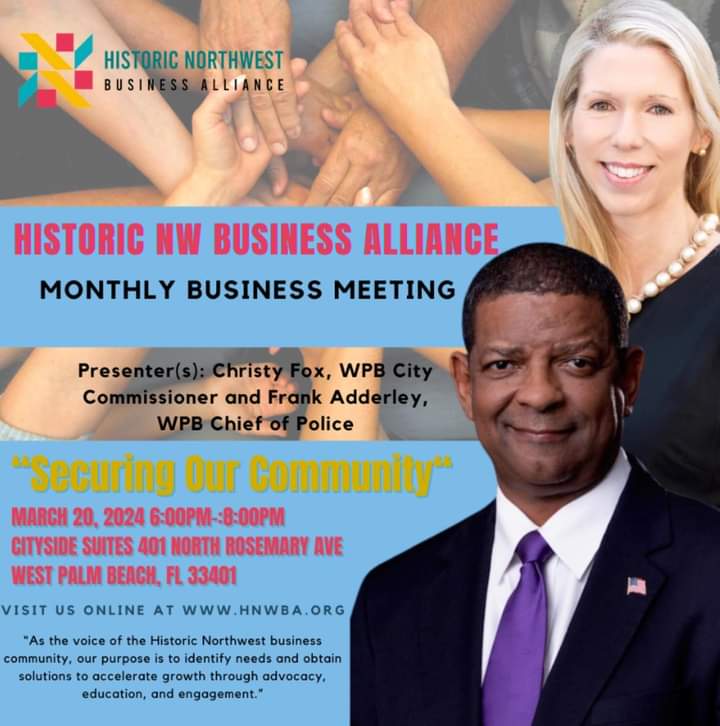 Calling all residents, business owners, and friends of the Historic NW 📢 The Historic Northwest Business Alliance is excited to extend an invitation to you to join us for a special forum focused on prioritizing security in the community. The special guests will be WPB City Commissioner, Christy Fox and WPB Chief of Police, Frank Adderley. We value your input and feedback and believe that by working together, we can make a meaningful difference in our community. 📅 : Wednesday, March 20, 2024 ⏰: 6:00pm 📍City Side Suites @ 401 North Rosemary Avenue West Palm Beach, FL 33401