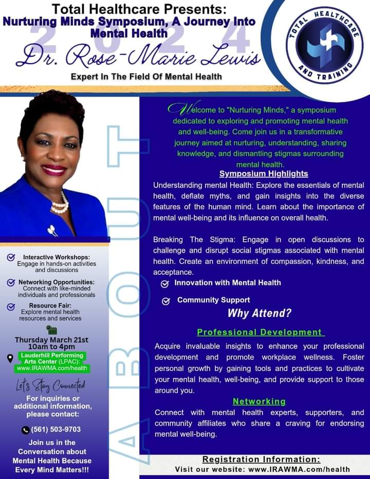 Mental Health is real:The stigma is decreasing. Come out to the Lauderhill Performing Arts Center (LPAC) tomorrow Thursday 3/21/24....10 AM - 4 PM. You may benefit from the information, or even to help someone else !!!.