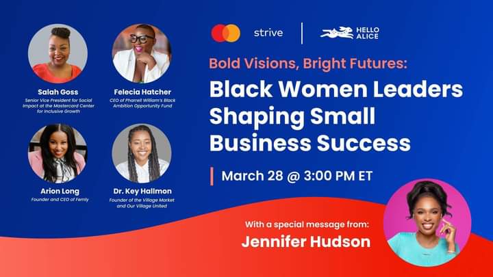 Join Hello Alice x Mastercard Strive for a special and empowering one-hour webinar event for small business owners! Tune in March 28 at 3:00 PM ET as industry leaders Salah M. Goss, Lakeysha Hallmon, EdD, Arion K Zannotti, and myself converge for a powerful discussion on navigating success as business owners. In addition to this panel of dynamic experts, who are not only creating opportunities but also nurturing the growth of small businesses, you’ll also get exclusive access to Salah's previously recorded chat with Oscar, Emmy, Tony, and Grammy Winner and Host of “The Jennifer Hudson Show”, Jennifer Hudson. [...]