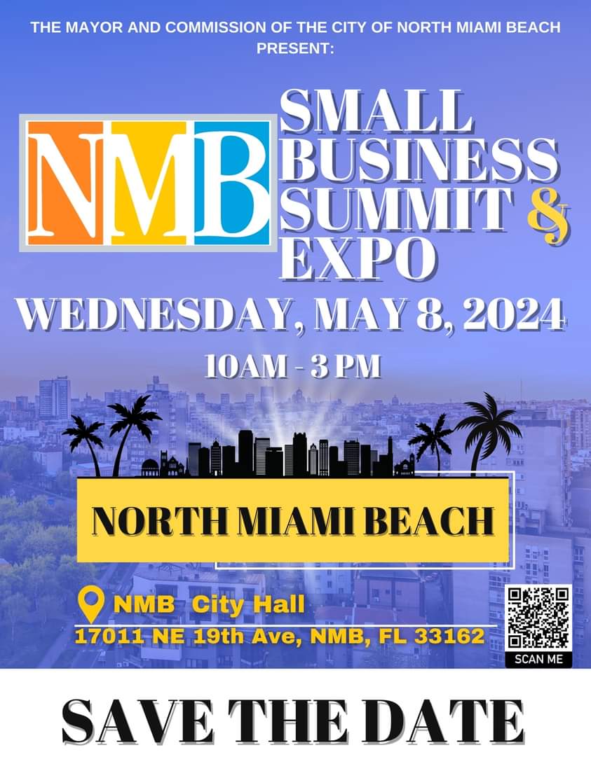 Mayor and Commission of the City of North Miami Beach will host the NMB Small Business Summit and Expo on Wednesday, May 8, 2024 at 17011 NE 19th Avenue, North Miami Beach, FL, from 10:00 am - 3:00 pm. Register at https://NMBSmallBusinessSummitExpo.eventbrite.com