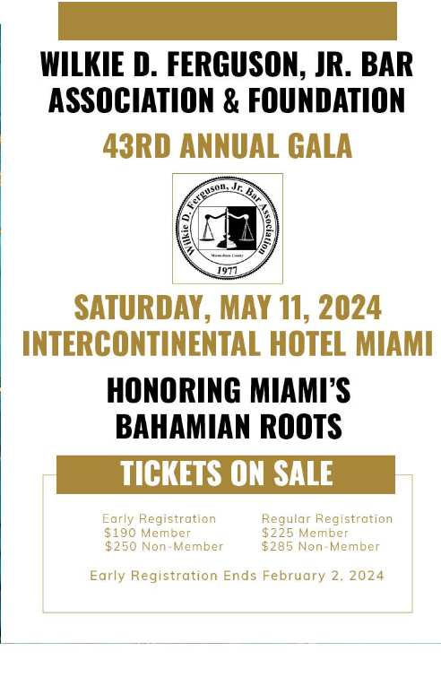 The Wilkie D. Ferguson, Jr. Bar Association & Foundation is honored to announce its 43rd Annual Scholarship & Installation Gala, which will celebrate the Bahamian Roots of Miami! The gala will be held at the InterContinental Miami and helps raises thousands of dollars in scholarships for law school students. Please help us honor the past and raise donations for our future.